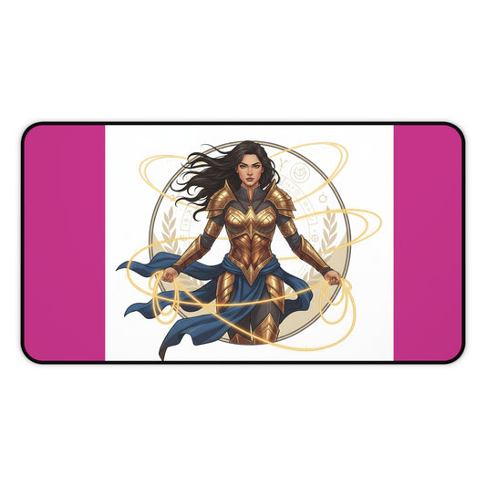 Wonder Warrior Desk Mat — Feminine Heroine Mouse Pad with Gold Armor Illustration