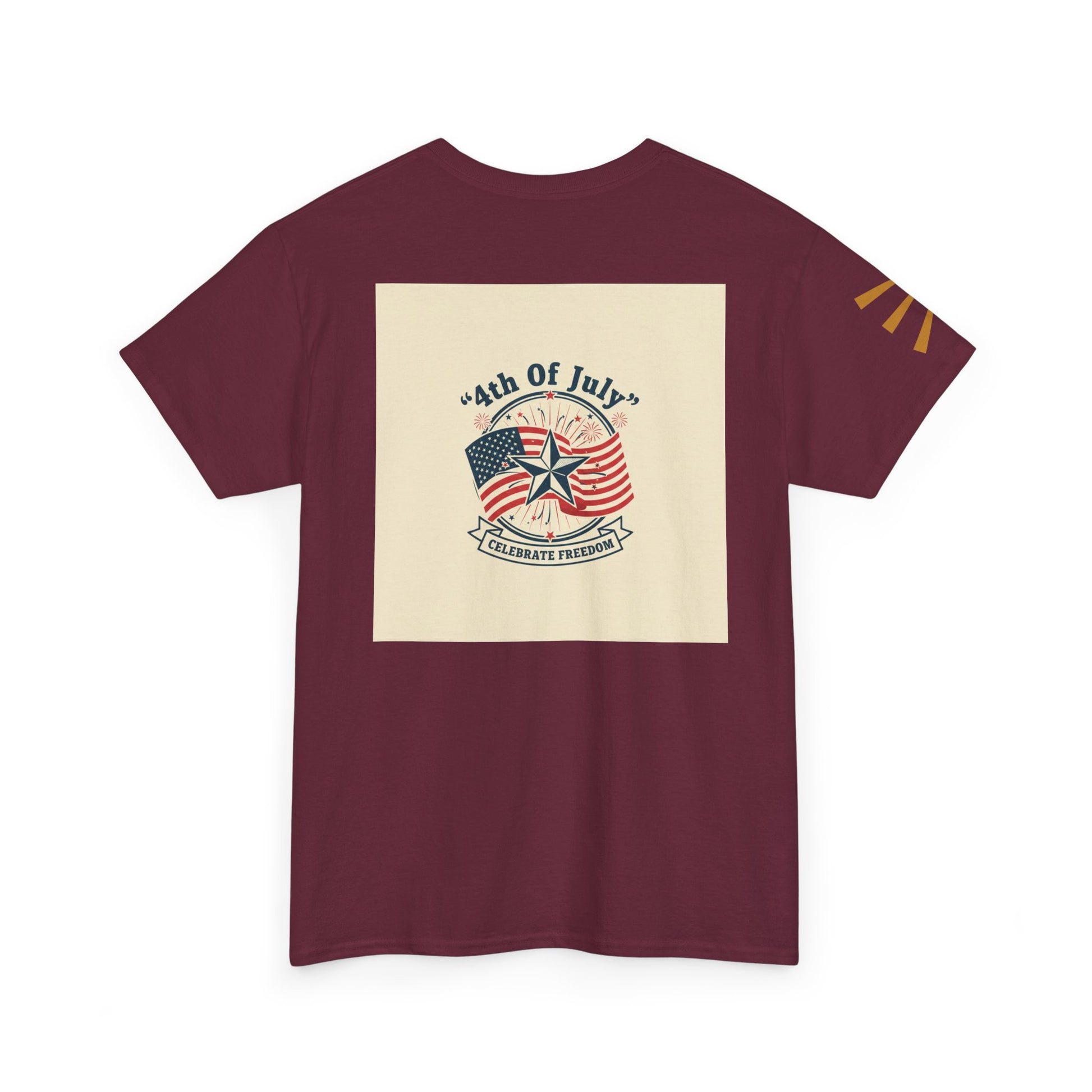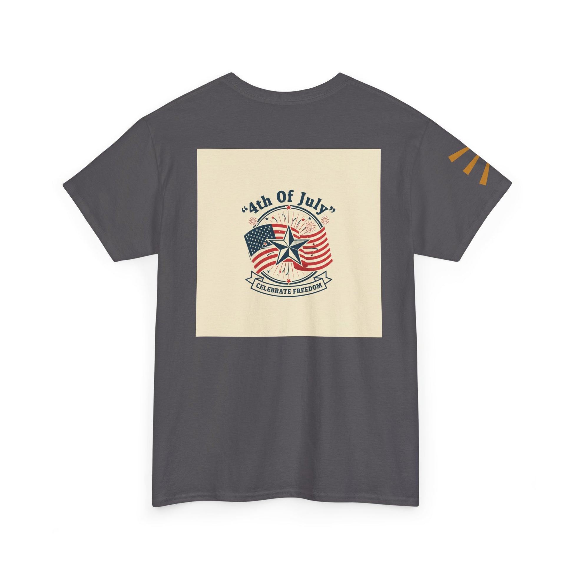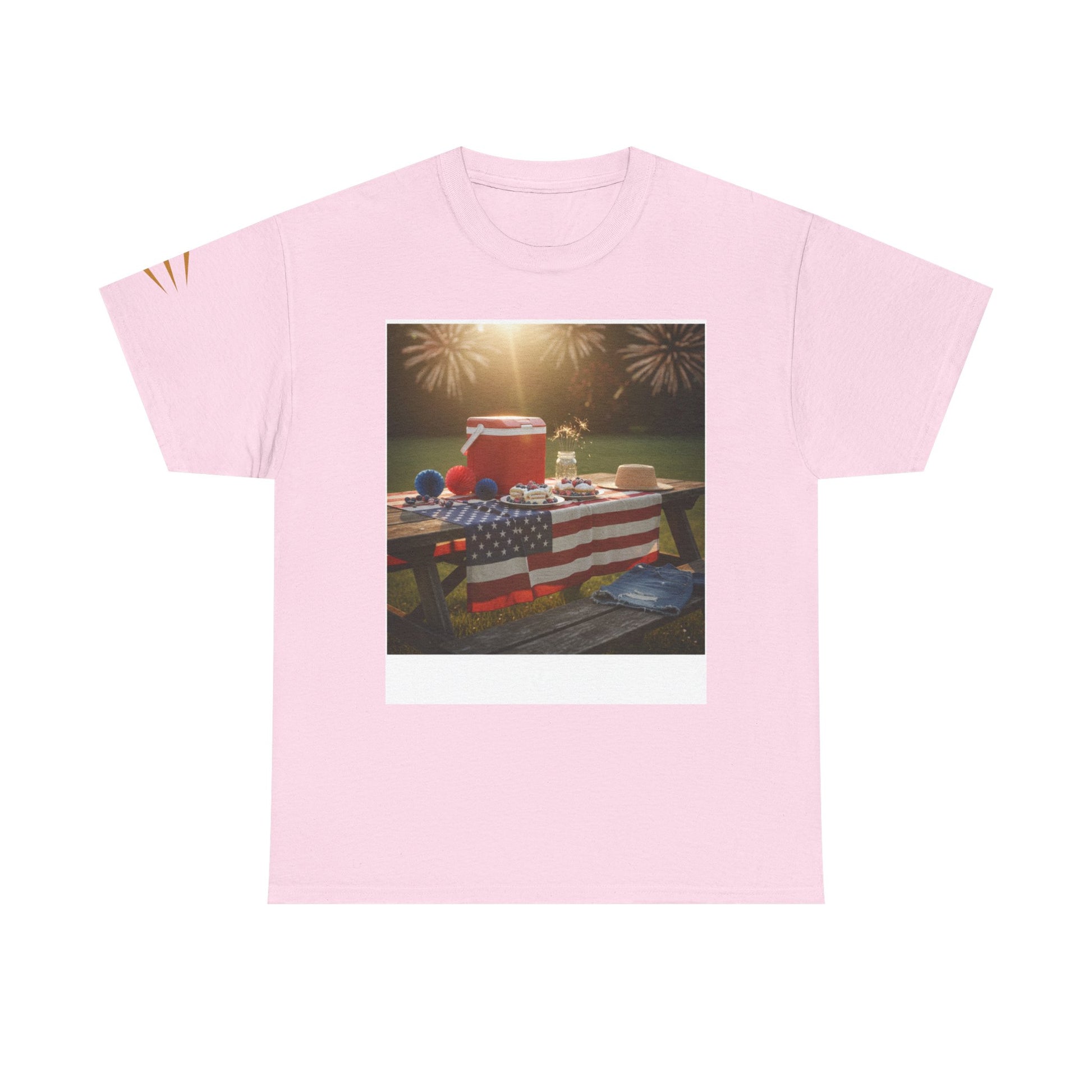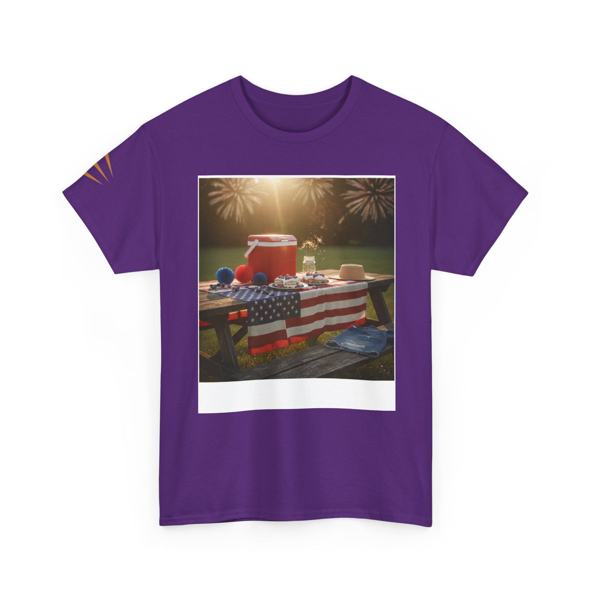 This relaxed heavy cotton tee carries the warm, sunlit energy of a backyard Fourth of July. The front shows a picnic table dressed in red-white-and-blue—coolers, plates, and blankets under soft fireworks—while the back features a vintage-style ’4th of July’ emblem and waving flag. Wear it to backyard barbecues, local parades, or when you want to keep summer memories close. The classic crew neck and roomy fit let you move between grill duty, lawn games, and late-night fireworks without fuss. Colors and printing are sturdy, keeping the retro look bright through many washes.