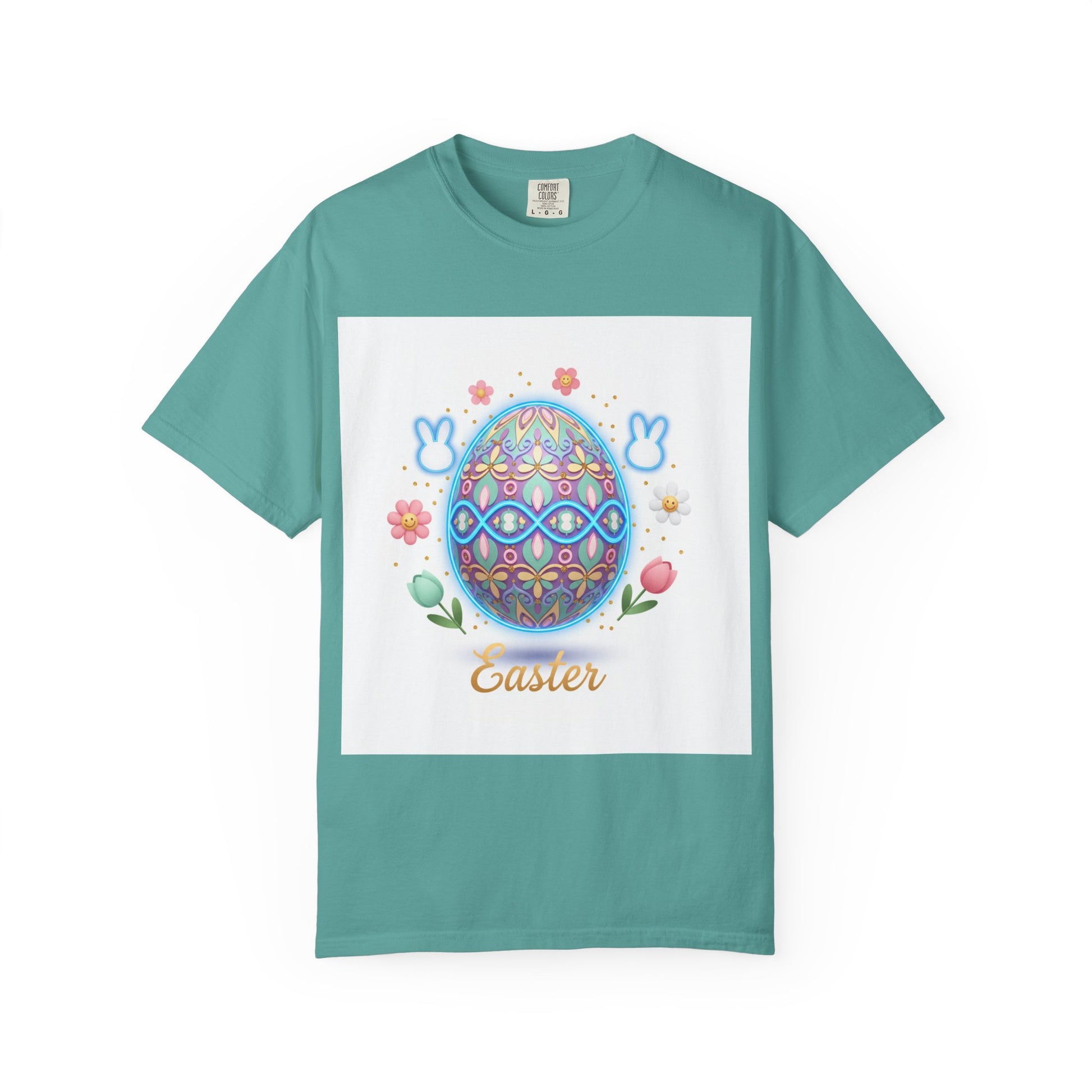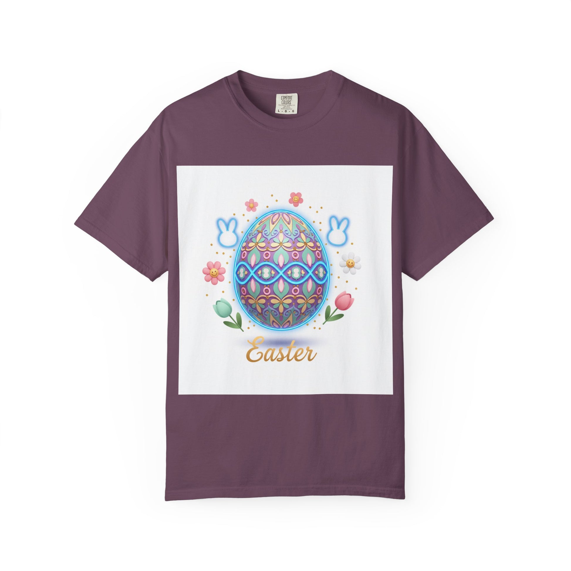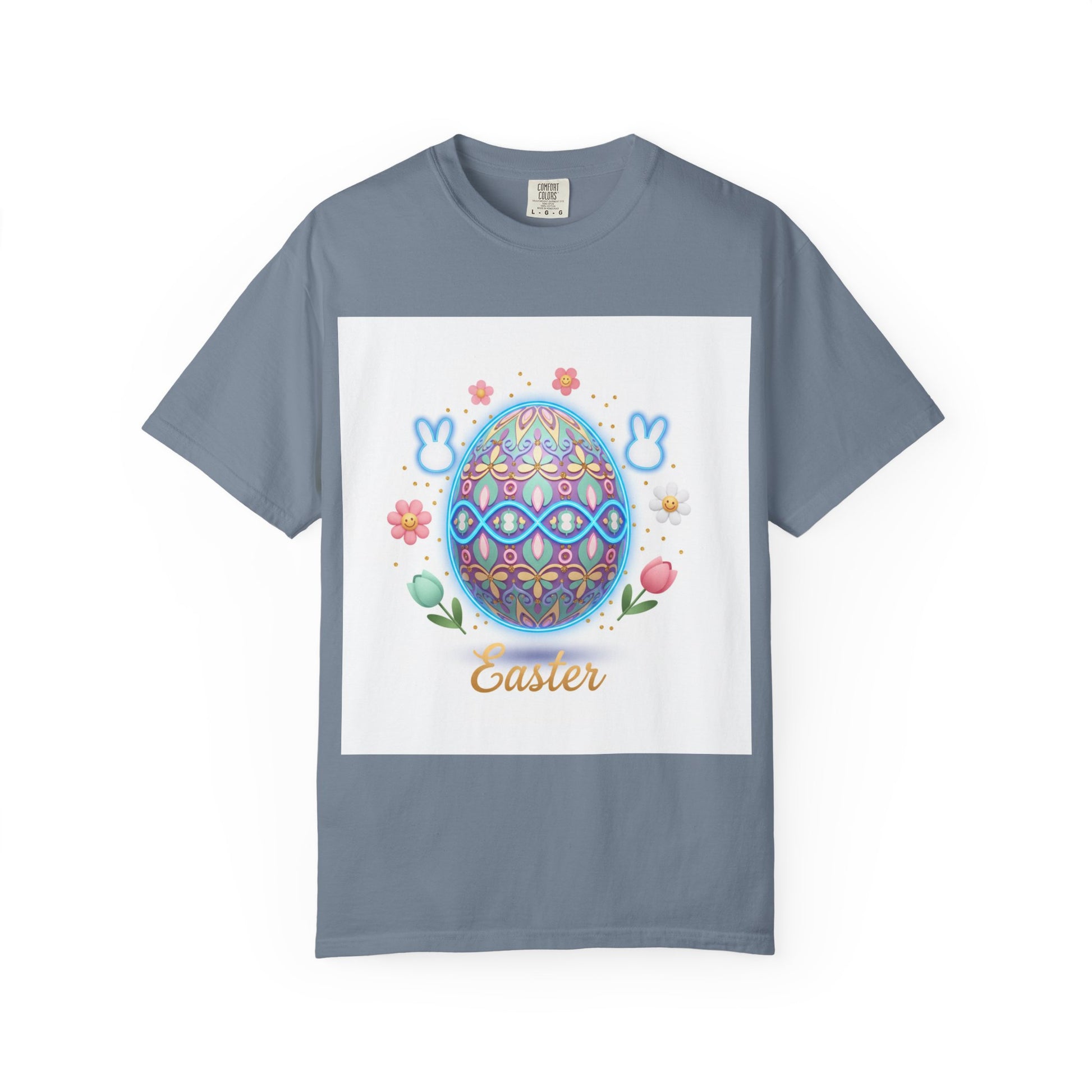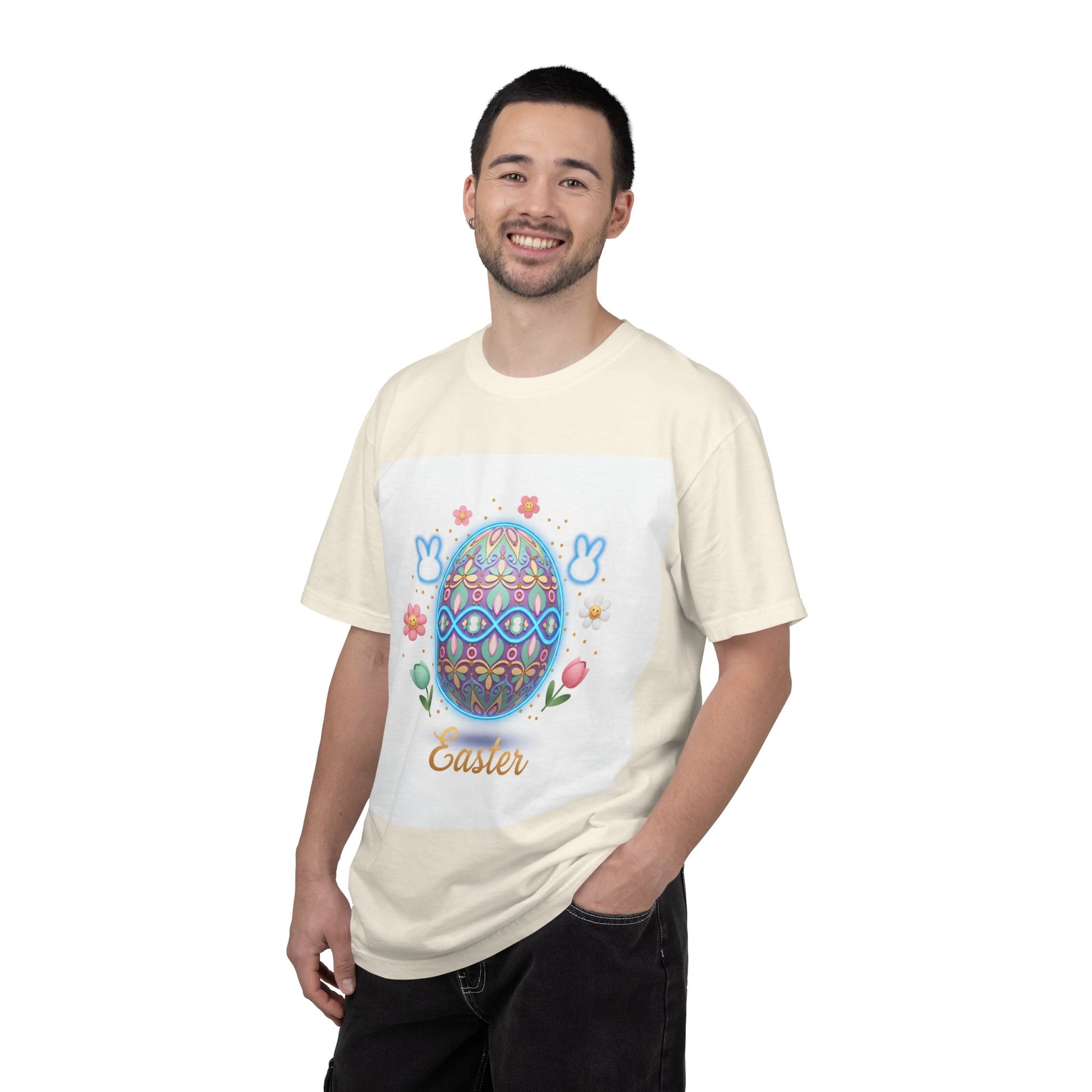 This relaxed, garment-dyed tee brings gentle springtime joy to everyday wear. The front features a hand-painted Easter egg motif in soft pastels, surrounded by tiny blooms and playful bunny silhouettes. On the back, a woven basket spills speckled eggs and pussy willow sprigs — a quiet, nostalgic scene that feels like a Sunday morning hunt in the backyard. The heavyweight cotton and washed-in color give the shirt a lived-in softness right away, while the roomy cut lets the design be worn casually with jeans, layered under a cardigan, or packed for a family gathering. It’s for people who love slow, tactile moments: egg-dyeing sessions, backyard brunches, and relaxed holiday strolls. The subtle vintage texture from the garment dye pairs with the watercolor-style artwork to make the shirt feel familiar from the first wear.