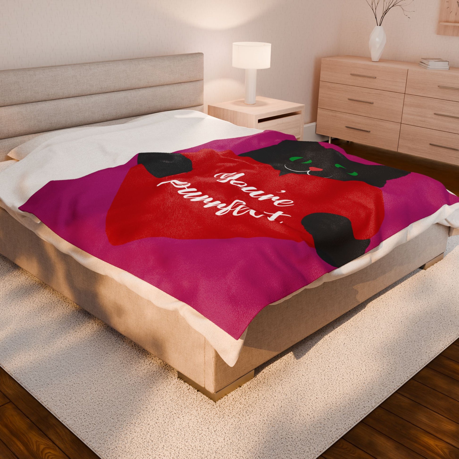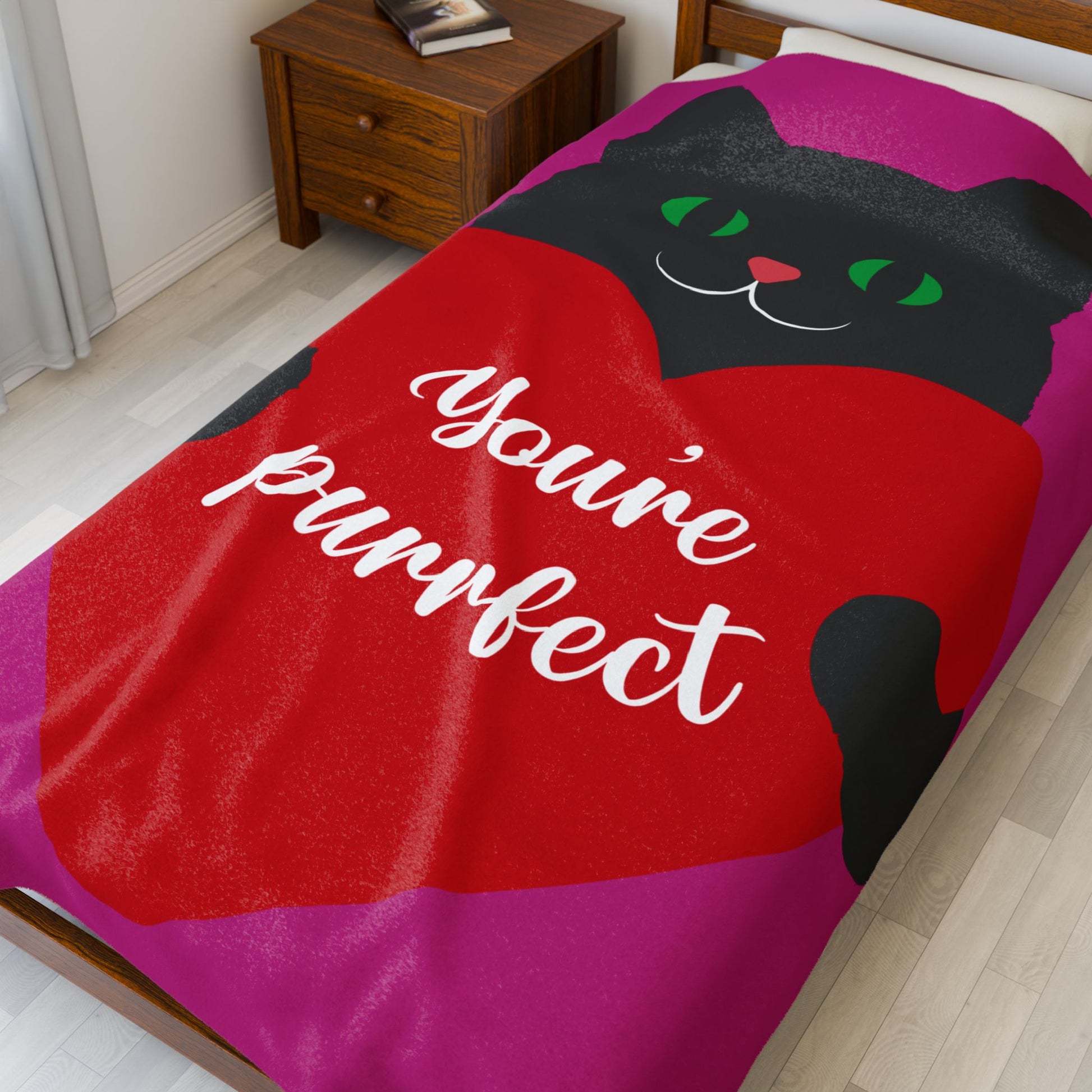 Wrap someone you love (or yourself) in a soft, velvety hug. This plush blanket features a wide-eyed black cat clutching a bright red heart that reads “You’re purrfect” — playful, warm, and quietly affectionate. The medium-weight fabric drapes smoothly across laps and couches, holding vibrant, high-detail color on one side so the illustration pops in any room. It’s the kind of throw you pull over your knees during movie nights, tuck around sleepy shoulders on a chilly evening, or lay across a bed to add a touch of cozy charm. The gentle texture and cheerful design create a small ritual: curling up, slowing down, and feeling noticed.
